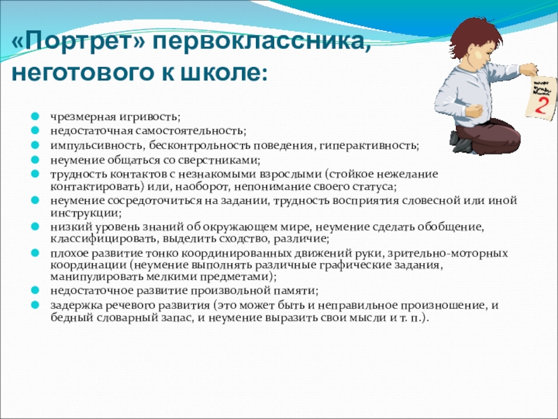 Слайд 15«Портрет» первоклассника, неготового к школе: