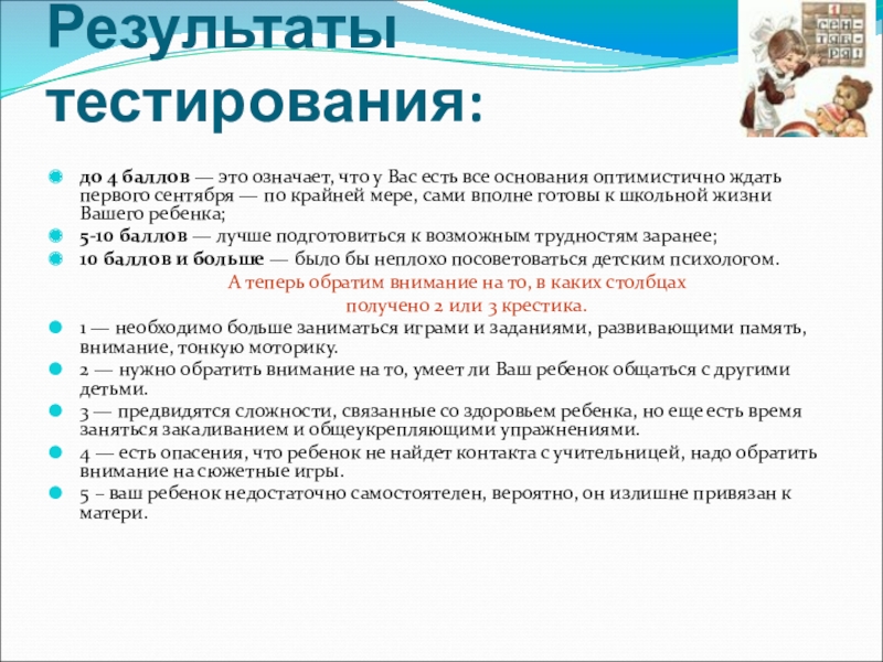 4 — есть опасения, что ребенок не найдет контакта с учительницей, надо обратить внимание на сюжетные игры.