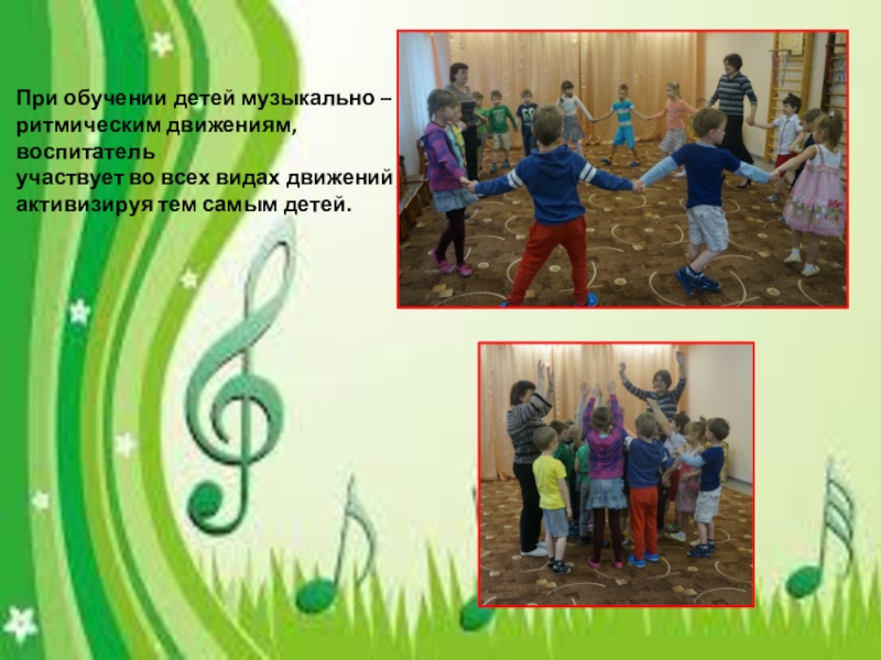 При обучении детей музыкально –ритмическим движениям, воспитательучаствует во всех видах движений,активизируя тем самым детей.