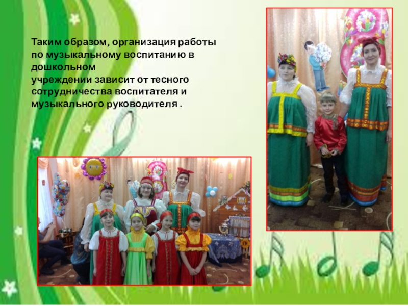 Таким образом, организация работыпо музыкальному воспитанию в дошкольномучреждении зависит от тесного сотрудничества воспитателя и музыкального руководителя .