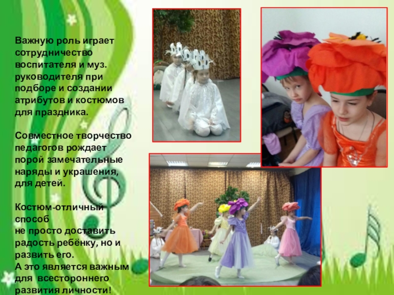 Важную роль играет сотрудничество воспитателя и муз. руководителя при подборе и создании атрибутов и костюмов для праздника.Совместное