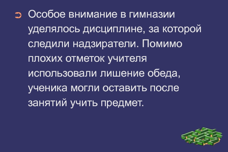 Слайд 9Особое внимание в гимназии уделялось дисциплине, за которой следили надзиратели. Помимо