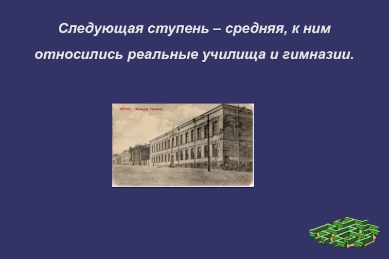 Слайд 4Следующая ступень – средняя, к ним относились реальные училища и гимназии.