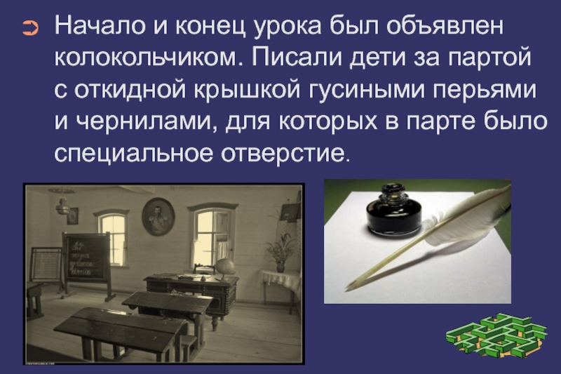 Начало и конец урока был объявлен колокольчиком. Писали дети за партой с откидной крышкой гусиными перьями и