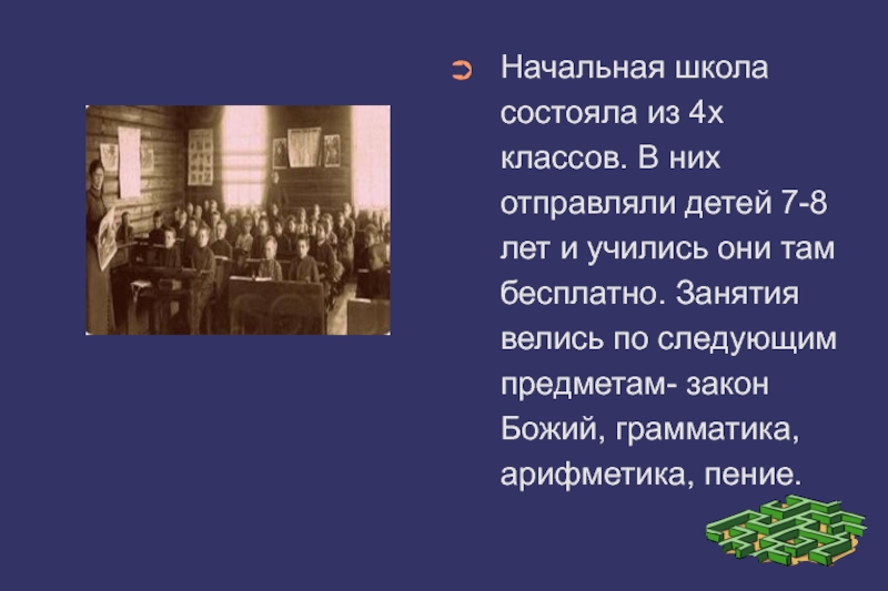 лет и учились они там бесплатно. Занятия велись по следующим предметам- закон Божий, грамматика, арифметика, пение.