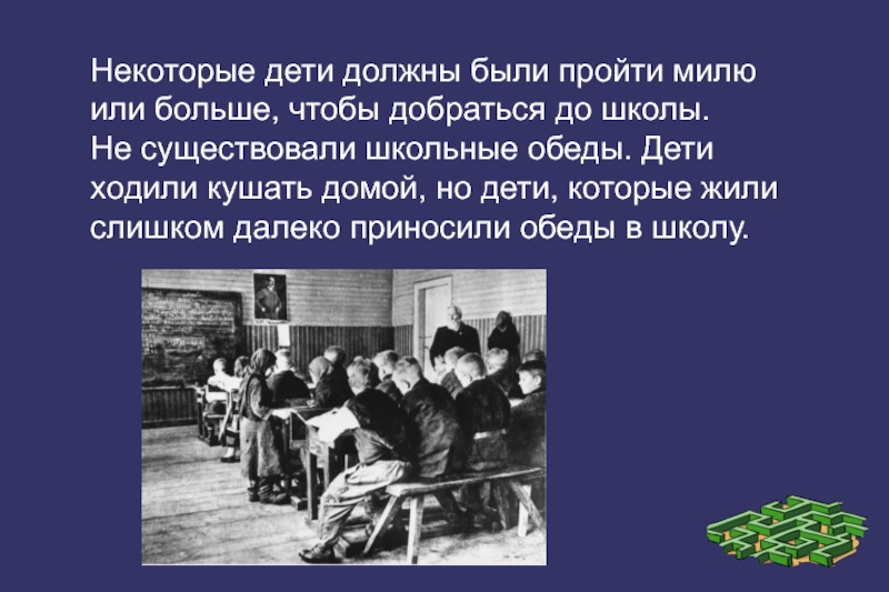 Некоторые дети должны были пройти милю или больше, чтобы добраться до школы. Не существовали школьные обеды. Дети