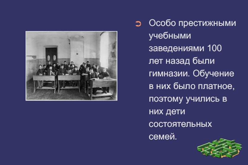 Особо престижными учебными заведениями 100 лет назад были гимназии. Обучение в них было платное, поэтому учились в