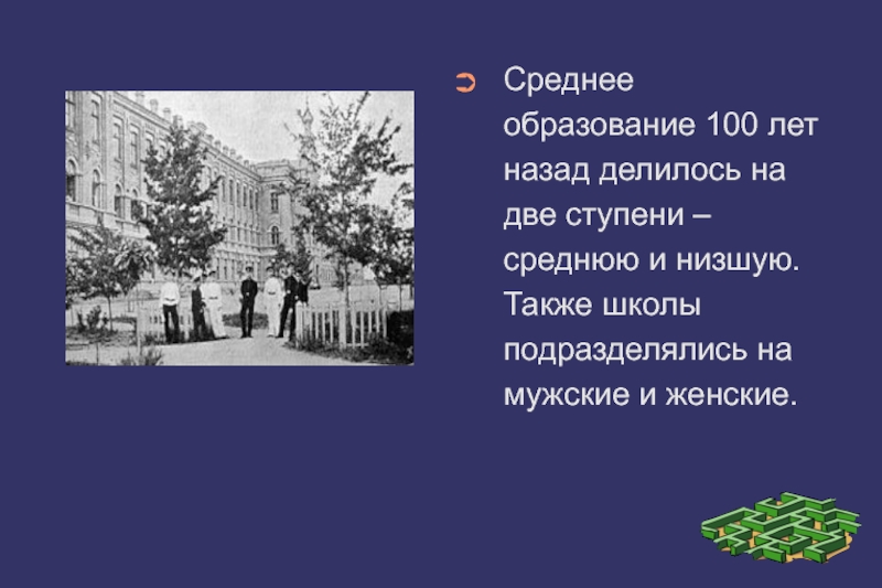 Среднее образование 100 лет назад делилось на две ступени – среднюю и низшую. Также школы подразделялись на мужские и женские.