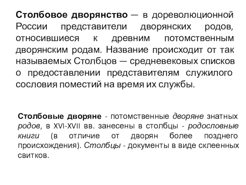 Столбовые дворяне - потомственные дворяне знатных родов, в XVI-XVII вв. занесены в столбцы - родословные книги (в отличие от дворян более позднего происхождения). Столбцы - документы в виде склеенных свитков.