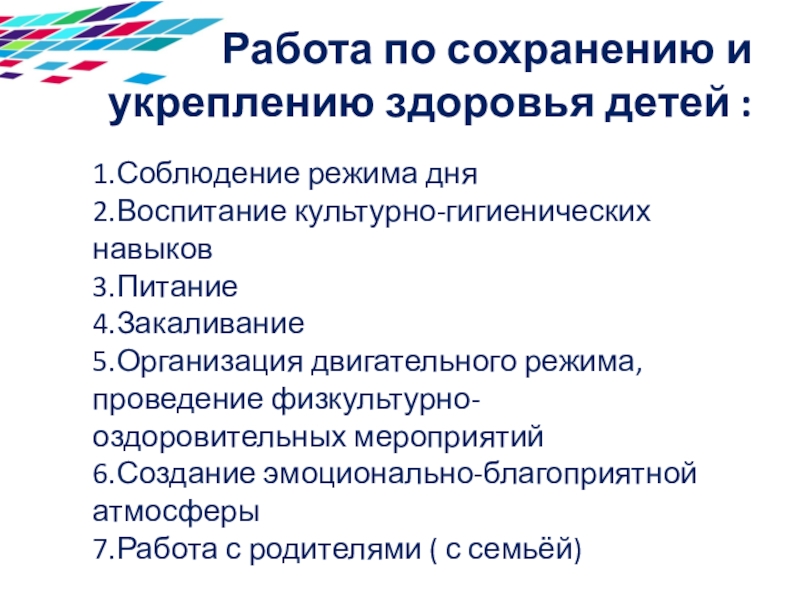 Слайд 3Работа по сохранению и укреплению здоровья детей :
