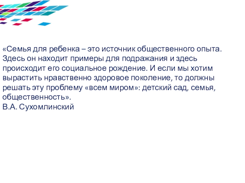 Слайд 2«Семья для ребенка – это источник общественного опыта. Здесь он находит