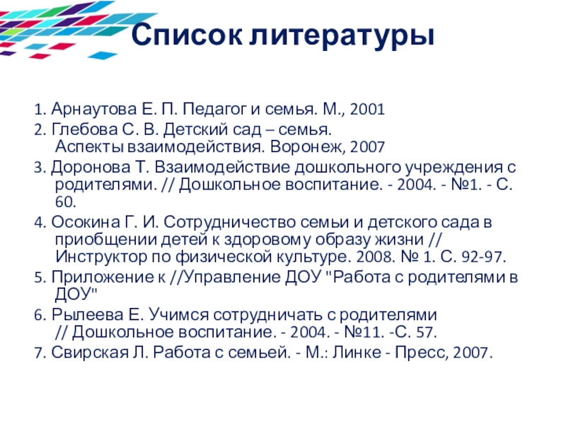 1. Арнаутова Е. П. Педагог и семья. М., 2001