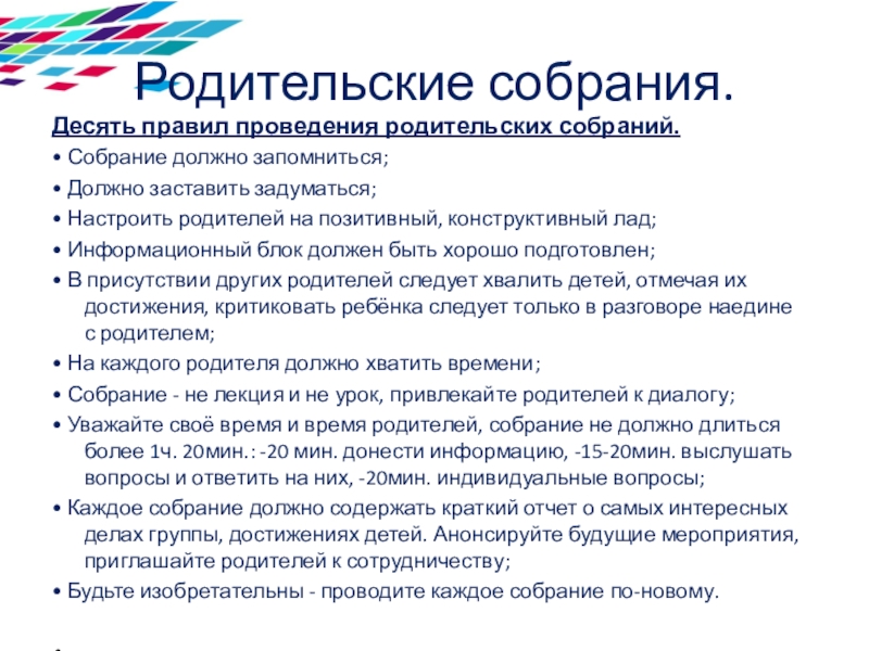 • Уважайте своё время и время родителей, собрание не должно длиться более 1ч. 20мин.: -20 мин. донести информацию, -15-20мин. выслушать вопросы и ответить на них, -20мин. индивидуальные вопросы;