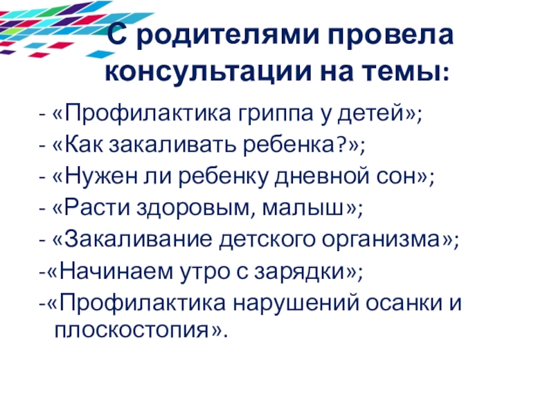 Слайд 13 С родителями провела консультации на темы: