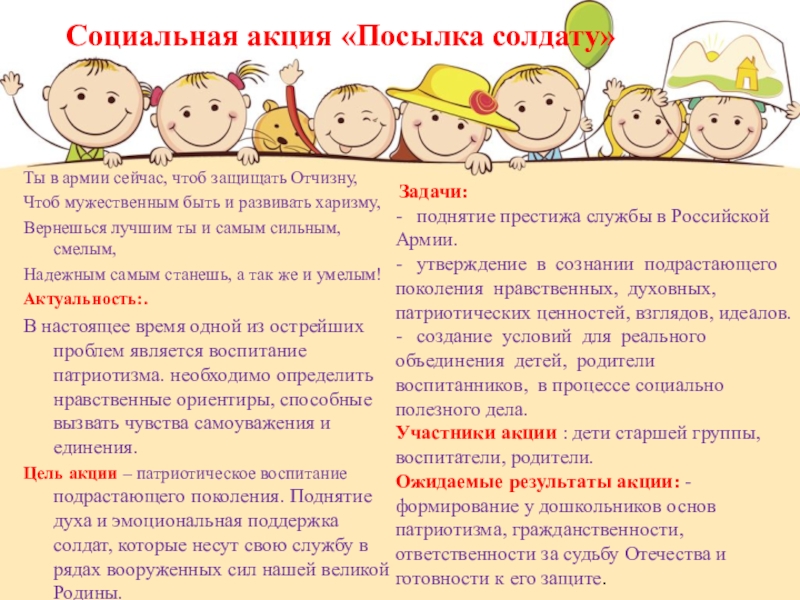 Цель акции – патриотическое воспитание подрастающего поколения. Поднятие духа и эмоциональная поддержка солдат, которые несут свою службу в рядах вооруженных сил нашей великой Родины.