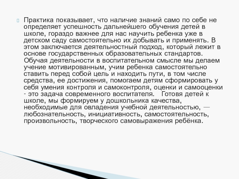 дальнейшего обучения детей в школе, гораздо важнее для нас научить ребенка уже в детском саду самостоятельно их добывать и применять. В этом заключается деятельностный подход, который лежит в основе государственных образовательных стандартов. Обучая деятельности в воспитательном смысле мы делаем учение мотивированным, учим ребенка самостоятельно ставить перед собой цель и находить пути, в том числе средства, ее достижения, помогаем детям сформировать у себя умения контроля и самоконтроля, оценки и самооценки - это задача современного воспитателя. Готовя детей к школе, мы формируем у дошкольника качества, необходимые для овладения учебной деятельностью, — любознательность, инициативность, самостоятельность, произвольность, творческого самовыражения ребёнка.