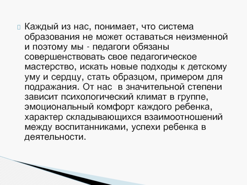 и поэтому мы - педагоги обязаны совершенствовать свое педагогическое мастерство, искать новые подходы к детскому уму и сердцу, стать образцом, примером для подражания. От нас в значительной степени зависит психологический климат в группе, эмоциональный комфорт каждого ребенка, характер складывающихся взаимоотношений между воспитанниками, успехи ребенка в деятельности.