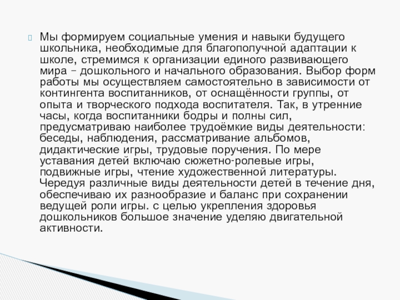 адаптации к школе, стремимся к организации единого развивающего мира – дошкольного и начального образования. Выбор форм работы мы осуществляем самостоятельно в зависимости от контингента воспитанников, от оснащённости группы, от опыта и творческого подхода воспитателя. Так, в утренние часы, когда воспитанники бодры и полны сил, предусматриваю наиболее трудоёмкие виды деятельности: беседы, наблюдения, рассматривание альбомов, дидактические игры, трудовые поручения. По мере уставания детей включаю сюжетно-ролевые игры, подвижные игры, чтение художественной литературы. Чередуя различные виды деятельности детей в течение дня, обеспечиваю их разнообразие и баланс при сохранении ведущей роли игры. с целью укрепления здоровья дошкольников большое значение уделяю двигательной активности.