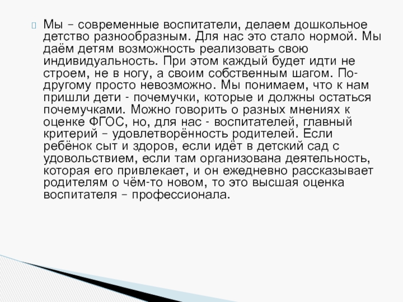 стало нормой. Мы даём детям возможность реализовать свою индивидуальность. При этом каждый будет идти не строем, не в ногу, а своим собственным шагом. По-другому просто невозможно. Мы понимаем, что к нам пришли дети - почемучки, которые и должны остаться почемучками. Можно говорить о разных мнениях к оценке ФГОС, но, для нас - воспитателей, главный критерий – удовлетворённость родителей. Если ребёнок сыт и здоров, если идёт в детский сад с удовольствием, если там организована деятельность, которая его привлекает, и он ежедневно рассказывает родителям о чём-то новом, то это высшая оценка воспитателя – профессионала.