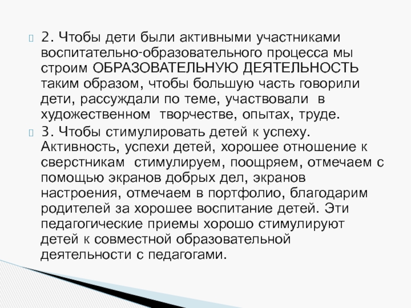 3. Чтобы стимулировать детей к успеху. Активность, успехи детей, хорошее отношение к сверстникам стимулируем, поощряем, отмечаем с помощью экранов добрых дел, экранов настроения, отмечаем в портфолио, благодарим родителей за хорошее воспитание детей. Эти педагогические приемы хорошо стимулируют детей к совместной образовательной деятельности с педагогами.