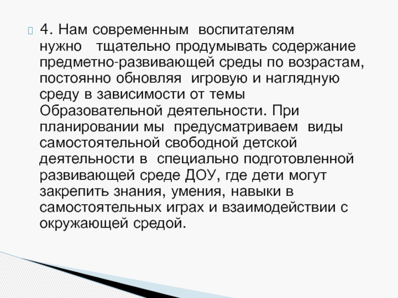 Слайд 94. Нам современным воспитателям нужно тщательно продумывать содержание предметно-развивающей среды по
