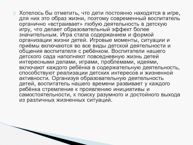 это образ жизни, поэтому современный воспитатель органично «встраивает» любую деятельность в детскую игру, что делает образовательный эффект более значительным. Игра стала содержанием и формой организации жизни детей. Игровые моменты, ситуации и приёмы включаются во все виды детской деятельности и общения воспитателя с ребёнком. Воспитатели нашего детского сада наполняют повседневную жизнь детей интересными делами, играми, проблемами, идеями, включают каждого ребёнка в содержательную деятельность, способствуют реализации детских интересов и жизненной активности. Организуя образовательную деятельность детей, воспитатель нашего времени развивает у каждого ребёнка стремление к проявлению инициативы и самостоятельности, к поиску разумного и достойного выхода из различных жизненных ситуаций.