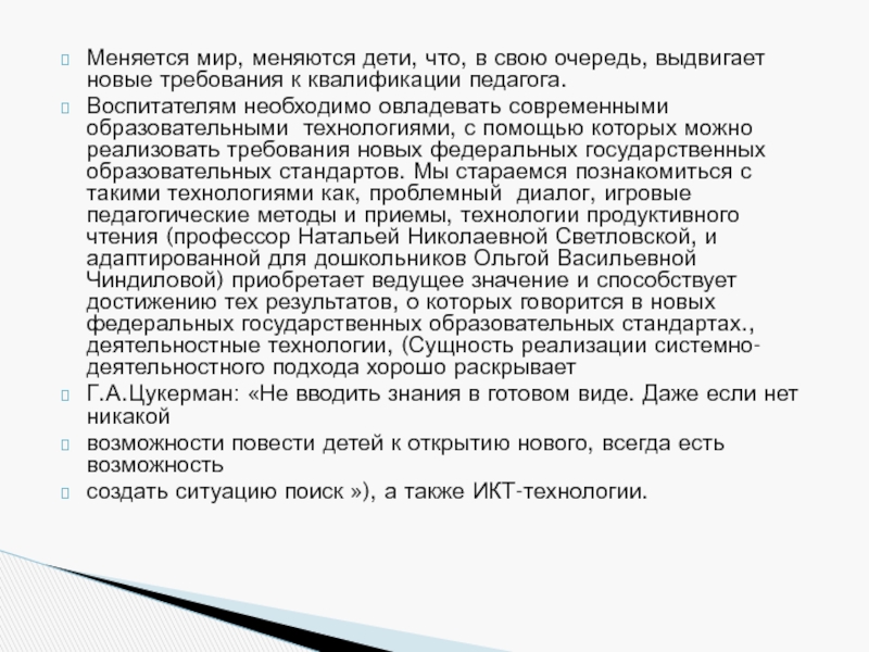 Воспитателям необходимо овладевать современными образовательными технологиями, с помощью которых можно реализовать требования новых федеральных государственных образовательных стандартов. Мы стараемся познакомиться с такими технологиями как, проблемный диалог, игровые педагогические методы и приемы, технологии продуктивного чтения (профессор Натальей Николаевной Светловской, и адаптированной для дошкольников Ольгой Васильевной Чиндиловой) приобретает ведущее значение и способствует достижению тех результатов, о которых говорится в новых федеральных государственных образовательных стандартах., деятельностные технологии, (Сущность реализации системно-деятельностного подхода хорошо раскрывает