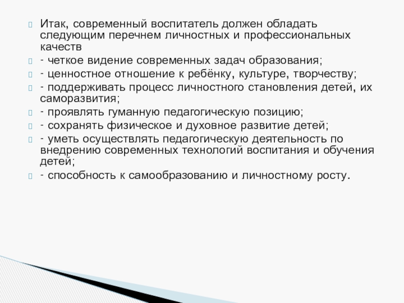 Слайд 18Итак, современный воспитатель должен обладать следующим перечнем личностных и профессиональных качеств