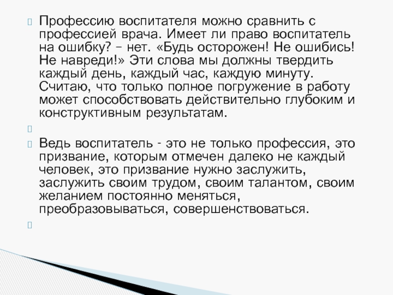 Ведь воспитатель - это не только профессия, это призвание, которым отмечен далеко не каждый человек, это призвание нужно заслужить, заслужить своим трудом, своим талантом, своим желанием постоянно меняться, преобразовываться, совершенствоваться.