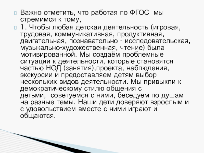 детская деятельность (игровая, трудовая, коммуникативная, продуктивная, двигательная, познавательно - исследовательская, музыкально-художественная, чтение) была мотивированной. Мы создаём проблемные ситуации к деятельности, которые становятся частью НОД (занятия),проекта, наблюдения, экскурсии и предоставляем детям выбор нескольких видов деятельности. Мы привыкли к демократическому стилю общения с детьми, советуемся с ними, беседуем по душам на разные темы. Наши дети доверяют взрослым и с удовольствием вместе с ними играют и общаются.