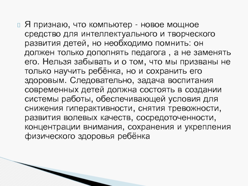 творческого развития детей, но необходимо помнить: он должен только дополнять педагога , а не заменять его. Нельзя забывать и о том, что мы призваны не только научить ребёнка, но и сохранить его здоровым. Следовательно, задача воспитания современных детей должна состоять в создании системы работы, обеспечивающей условия для снижения гиперактивности, снятия тревожности, развития волевых качеств, сосредоточенности, концентрации внимания, сохранения и укрепления физического здоровья ребёнка