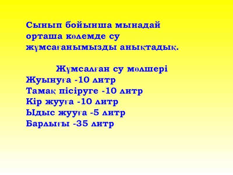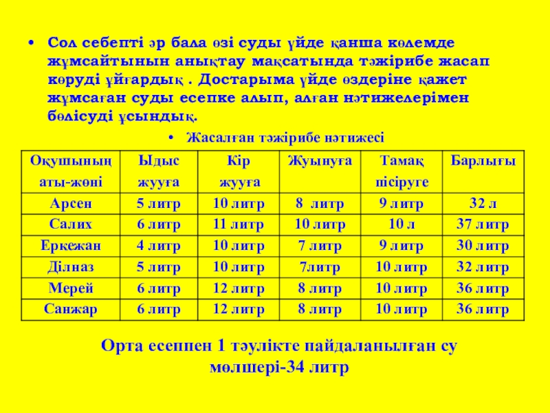 мақсатында тәжірибе жасап көруді ұйғардық . Достарыма үйде өздеріне қажет жұмсаған суды есепке алып, алған нәтижелерімен бөлісуді ұсындық.