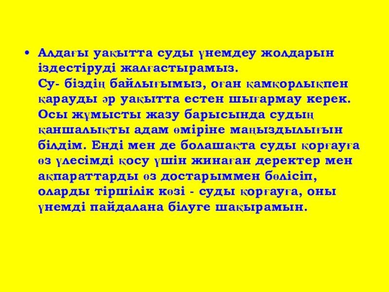 қамқорлықпен қарауды әр уақытта естен шығармау керек. Осы жұмысты жазу барысында судың қаншалықты адам өміріне маңыздылығын білдім. Енді мен де болашақта суды қорғауға өз үлесімді қосу үшін жинаған деректер мен ақпараттарды өз достарыммен бөлісіп, оларды тіршілік көзі - суды қорғауға, оны үнемді пайдалана білуге шақырамын.