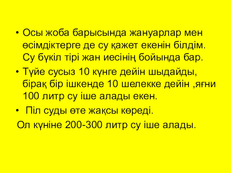 Слайд 12Осы жоба барысында жануарлар мен өсімдіктерге де су қажет екенін білдім.