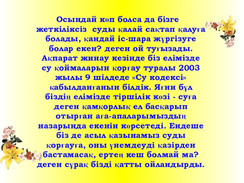 болады, қандай іс-шара жүргізуге болар екен? деген ой туғызады. Ақпарат жинау кезінде біз елімізде су қоймаларын қорғау туралы 2003 жылы 9 шілдеде «Су кодексі» қабылданғанын білдік. Яғни бұл біздің елімізде тіршілік көзі - суға деген қамқорлық ел басқарып отырған аға-апаларымыздың назарында екенін көрсетеді. Ендеше біз де асыл қазынамыз суды қорғауға, оны үнемдеуді қазірден бастамасақ, ертең кеш болмай ма? деген сұрақ бізді қатты ойландырды.