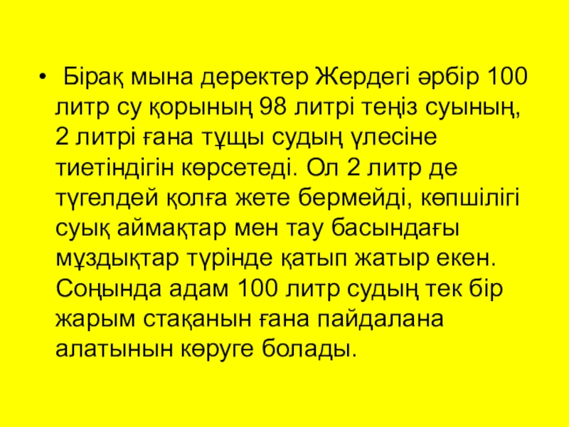 Слайд 13 Бірақ мына деректер Жердегі әрбір 100 литр су қорының 98