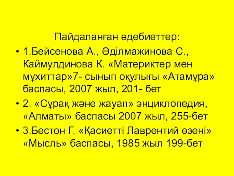 1.Бейсенова А., Әділмажинова С., Каймулдинова К. «Материктер мен мұхиттар»7- сынып