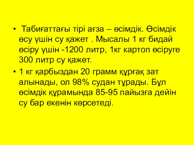 Мысалы 1 кг бидай өсіру үшін -1200 литр, 1кг картоп өсіруге 300 литр су қажет.