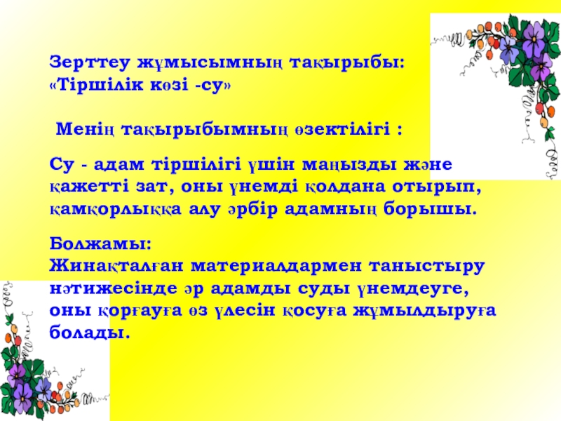 Зерттеу жұмысымның тақырыбы: «Тіршілік көзі -су»