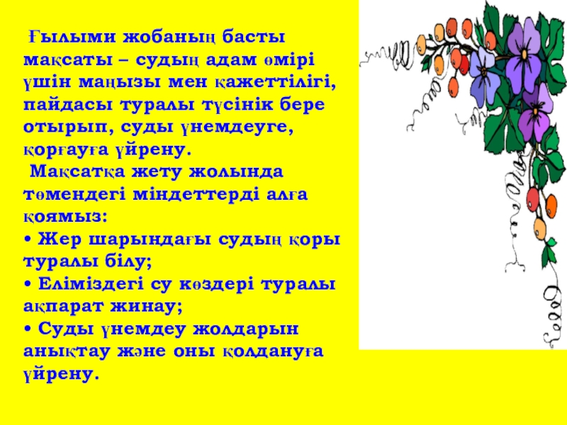 Слайд 4 Ғылыми жобаның басты мақсаты – судың адам өмірі үшін маңызы