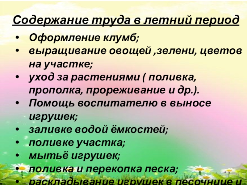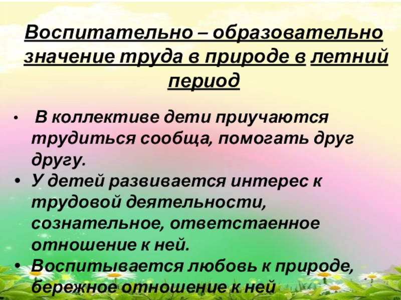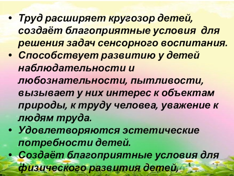 Труд расширяет кругозор детей, создаёт благоприятные условия для решения задач