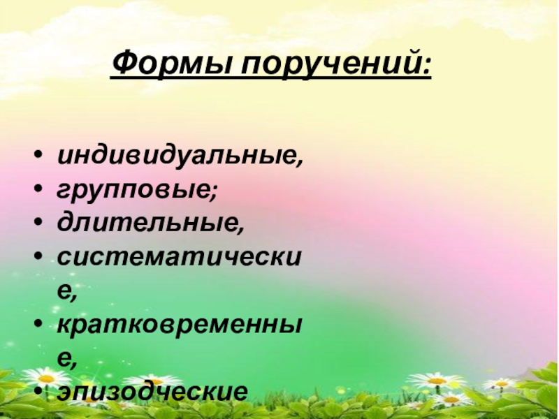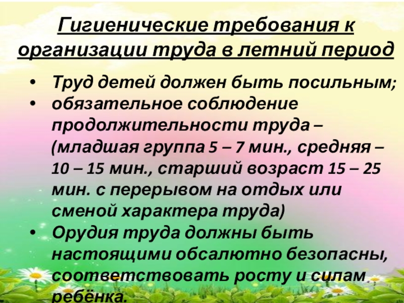 обязательное соблюдение продолжительности труда – (младшая группа 5 – 7 мин., средняя – 10 – 15 мин., старший возраст 15 – 25 мин. с перерывом на отдых или сменой характера труда)