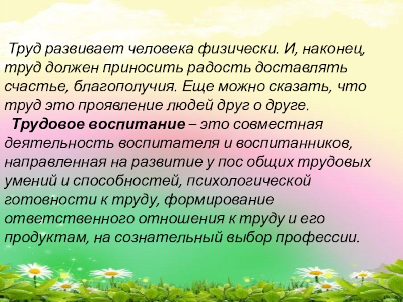 Трудовое воспитание – это совместная деятельность воспитателя и воспитанников, направленная на развитие у пос общих трудовых умений и способностей, психологической готовности к труду, формирование ответственного отношения к труду и его продуктам, на сознательный выбор профессии.