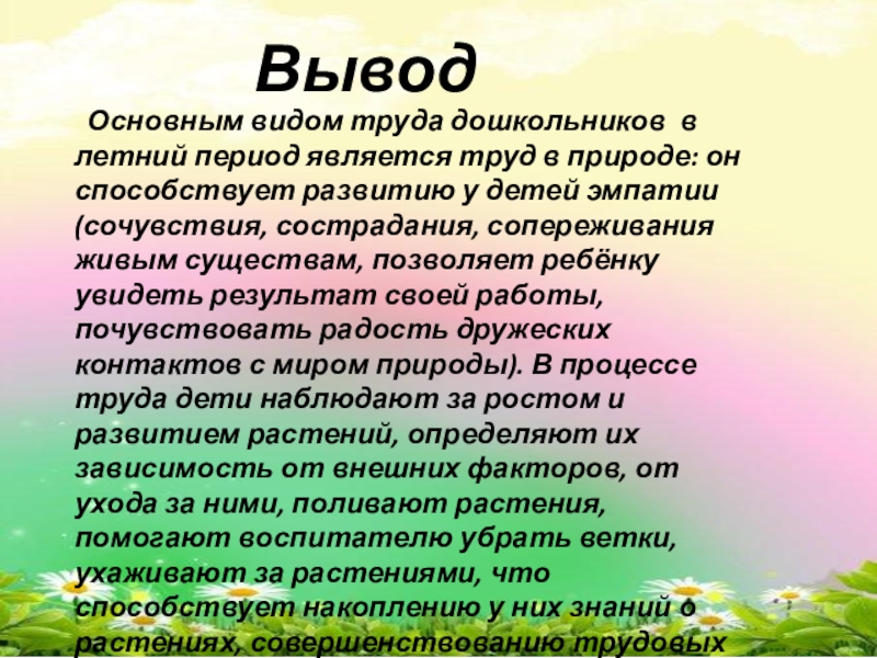 природе: он способствует развитию у детей эмпатии (сочувствия, сострадания, сопереживания живым существам, позволяет ребёнку увидеть результат своей работы, почувствовать радость дружеских контактов с миром природы). В процессе труда дети наблюдают за ростом и развитием растений, определяют их зависимость от внешних факторов, от ухода за ними, поливают растения, помогают воспитателю убрать ветки, ухаживают за растениями, что способствует накоплению у них знаний о растениях, совершенствованию трудовых навыков и умений, воспитанию трудолюбия.
