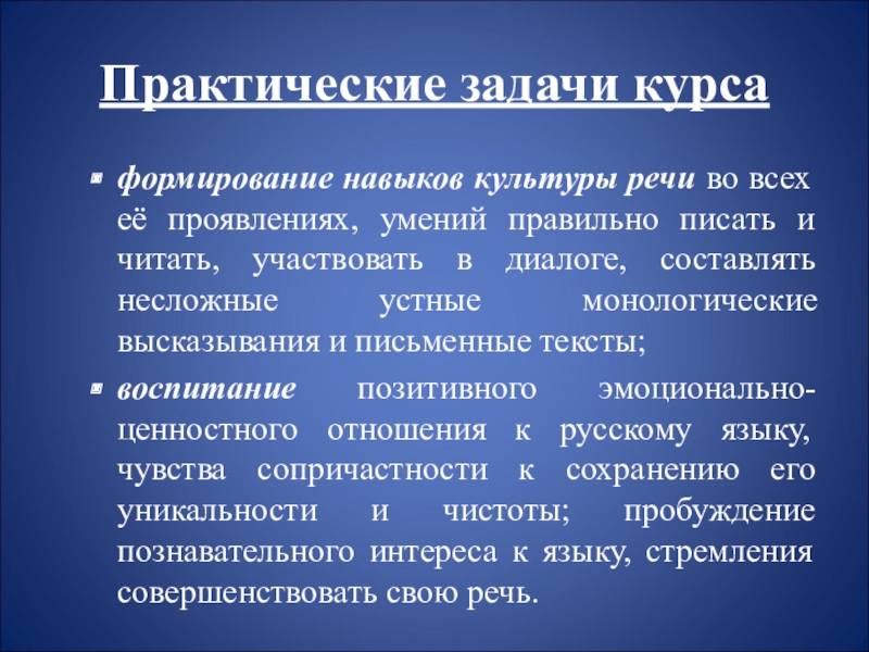 развитие устной и письменной речи, монологической и диалогической ее форм, а также навыков грамотного, безошибочного письма как показателя общей культуры человека.