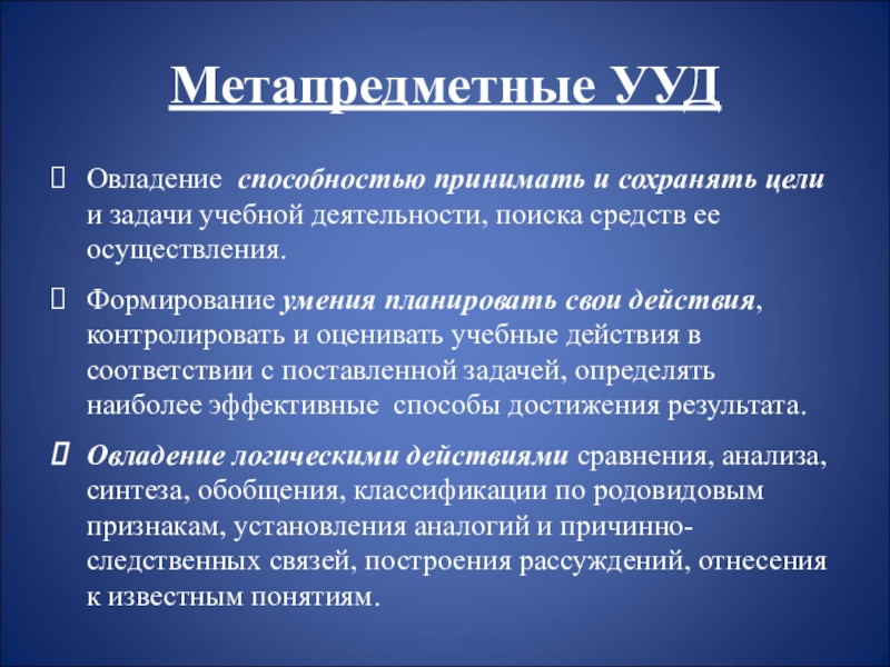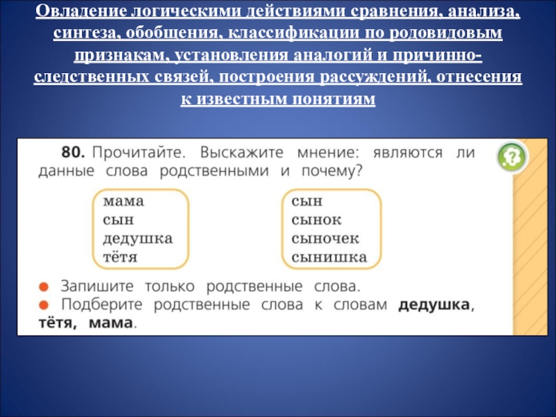 Овладение логическими действиями сравнения, анализа, синтеза, обобщения, классификации по родовидовым признакам, установления аналогий и причинно-следственных связей, построения рассуждений, отнесения к известным понятиям.
