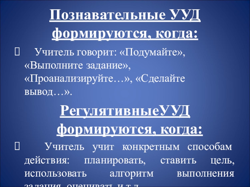 Учитель учит конкретным способам действия: планировать, ставить цель, использовать алгоритм выполнения задания, оценивать и т.д.