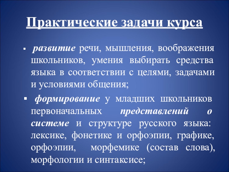 формирование у младших школьников первоначальных представлений о системе и структуре русского языка: лексике, фонетике и орфоэпии, графике, орфоэпии, морфемике (состав слова), морфологии и синтаксисе;