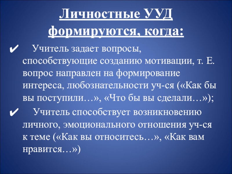 Учитель способствует возникновению личного, эмоционального отношения уч-ся к теме («Как вы относитесь…», «Как вам нравится…»)