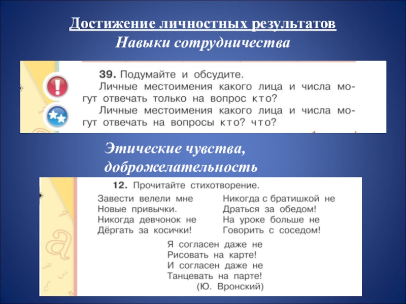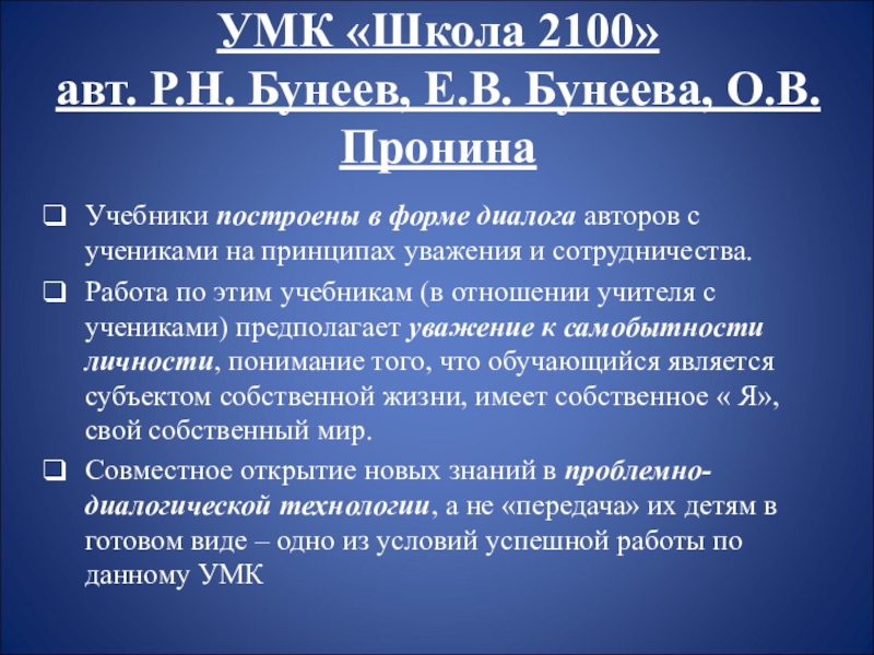 Работа по этим учебникам (в отношении учителя с учениками) предполагает уважение к самобытности личности, понимание того, что обучающийся является субъектом собственной жизни, имеет собственное « Я», свой собственный мир.